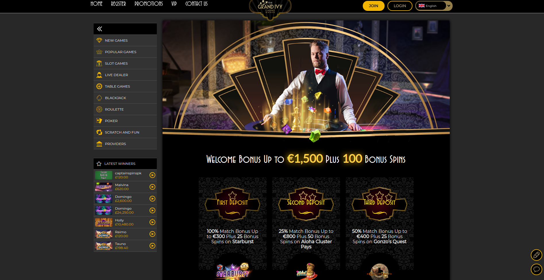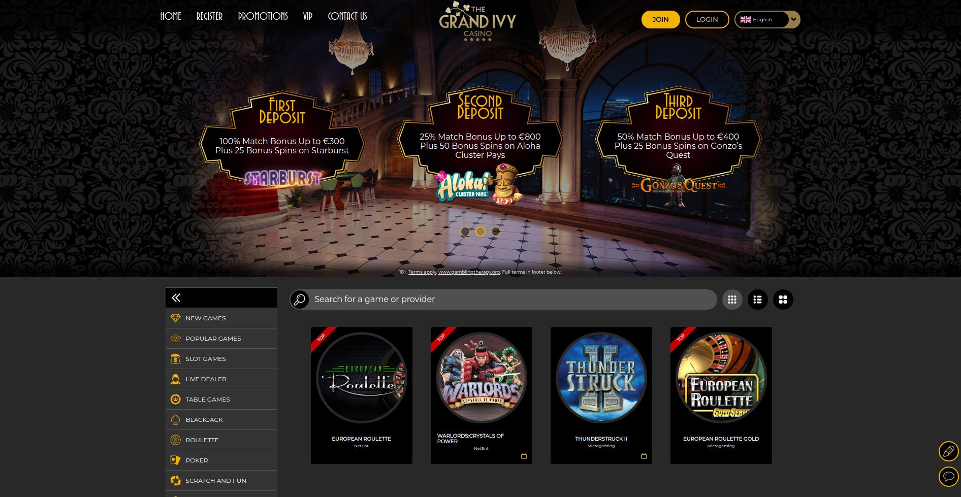 Med tusentals interaktiva online spel bjuder Grand Ivy Casino in dig på en resa som aldrig förr, här finns ett maffigt spelbibliotek, som är spännande och intressant! Om du är ute efter de allra senaste spelautomaterna finns de även representerade på denna spelsajt då man ständigt tar in nya casinospel. Spelmiljön känns genuin och lockande då designen är stilren och enkel att använda. De allra flesta spel som finns på casinot funkar även på mobilcasinot genom att spelare klickar in sig på mobilversionen genom din valda mobil eller surfplatta. Och vare sig du väljer att spela genom datorn eller mobilen så finns otroligt många spelautomater med många kända namn och speltitlar. Dessa spelautomater är trygga och de bästa just nu. Spelleverantörerna bakom dessa kända spel kan du hitta i en specifik kategori ”leverantörer” på spelsajten och inkluderar namn som: Microgaming, BetSoft, NYX, Aristocrat, Amaya, Quickspin, Ezugi och mer. Den stora variationen och de olika spelen lovar att nätcasinot har något för varje enskild spelare som vill prova något nytt och prestigefyllt. Med mer än 1000 olika spel finns mycket att välja mellan med spännande titlar som: Starburst, WarLords, Aloha Cluster Pays, Twin Spin, Jack Hammer 2 och Guns N Roses etc.