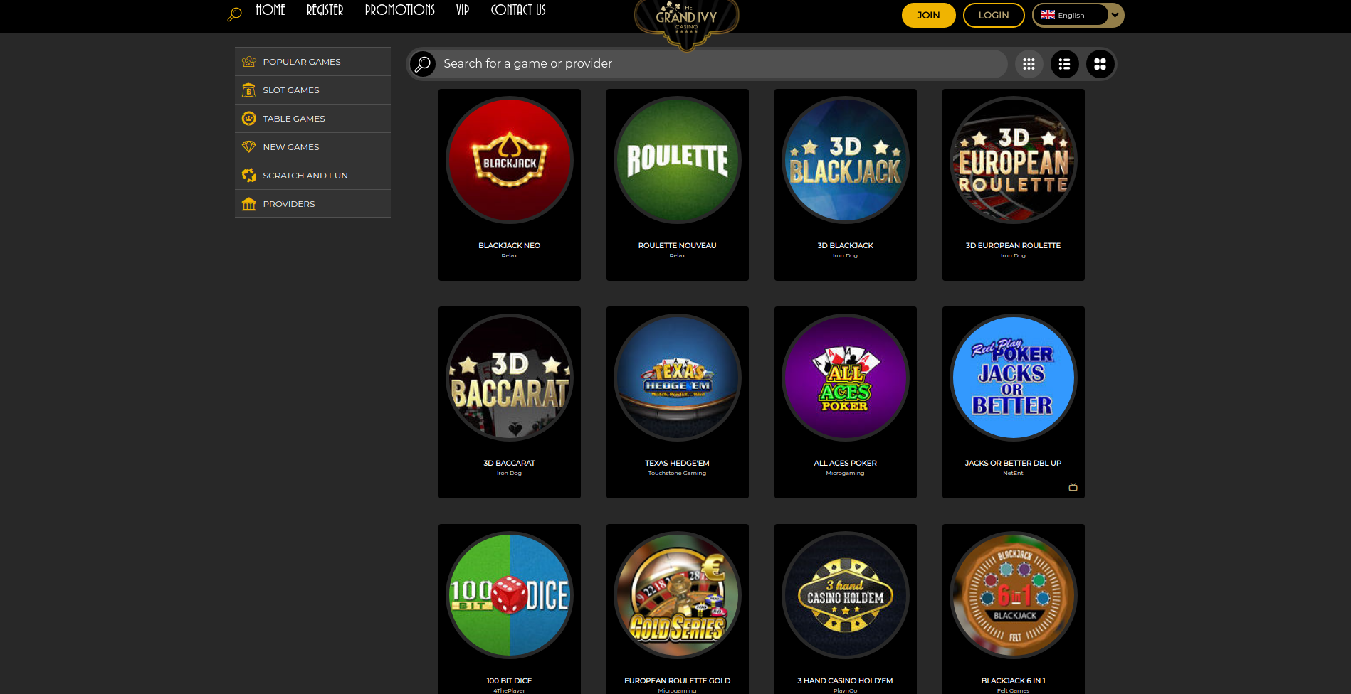 Det är tydligt att spelautomater är en stor del av Grand Ivy Casinos spelutbud men det skulle inte vara ett utmärkt nätcasino utan alla spännande kort och bordsspel. Spelupplevelsen är helt enkelt komplett då det finns ett spel för varje tillfälle. I kategorin Casino kommer du hitta underkategorier som live casino, toppspel, roulett, blackjack, bordsspel, poker och skraplotter. Det betyder att Grand Ivy är packad med spännande skraplotter och blackjackspel. Dessutom finns även många spännande live casinospel från leverantörer som NetEnt som bjuder på en speciell casinoupplevelse – där du har möjligheten att spela mot andra spelare eller mot en dealer i en autentisk casinomiljö. Överlag, kan man säga att de flesta spelare kommer hitta något intressant hos Grand Ivy Casino!