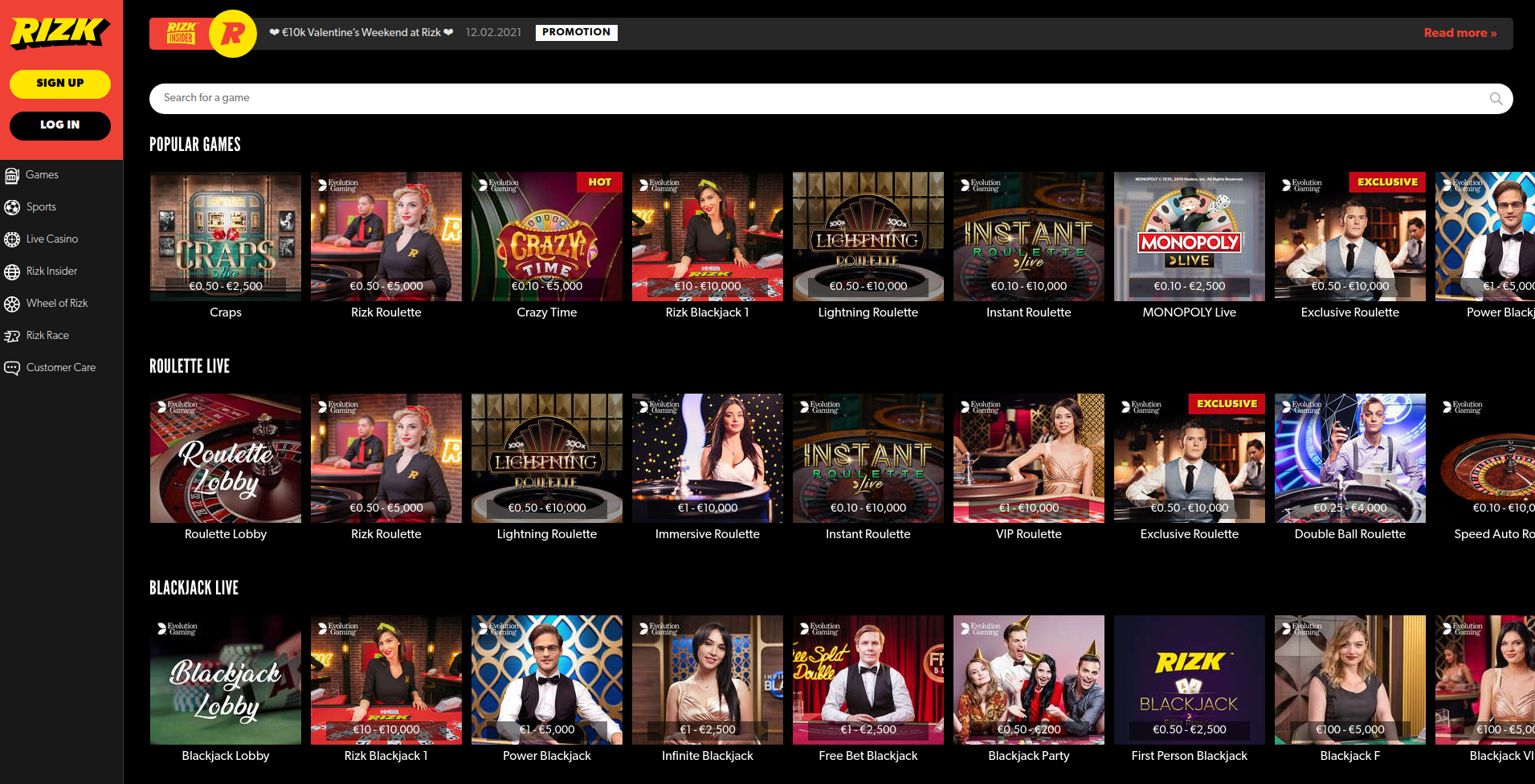 Nätcasino Rizk har över 1000 olika spel och däribland ett stort antal spelautomater som skapats av världens bästa spelutvecklare idag. Med välkända namn som svenska Netent, Quickspin och Betsoft med flera, så har man samlat ihop ett fint gäng av leverantörer - som lätt imponerar de allra flesta. Spelkategorierna är fördelade med följande kategorier: Casino, Odds och Live casino. Denna filtrering gör plattformen mer överskådlig och lättillgänglig, då spelaren lätt kan navigera till den specifika spelkategorien man är ute efter. Här hittar du också information om varje kategori för att förenkla ditt spelande.